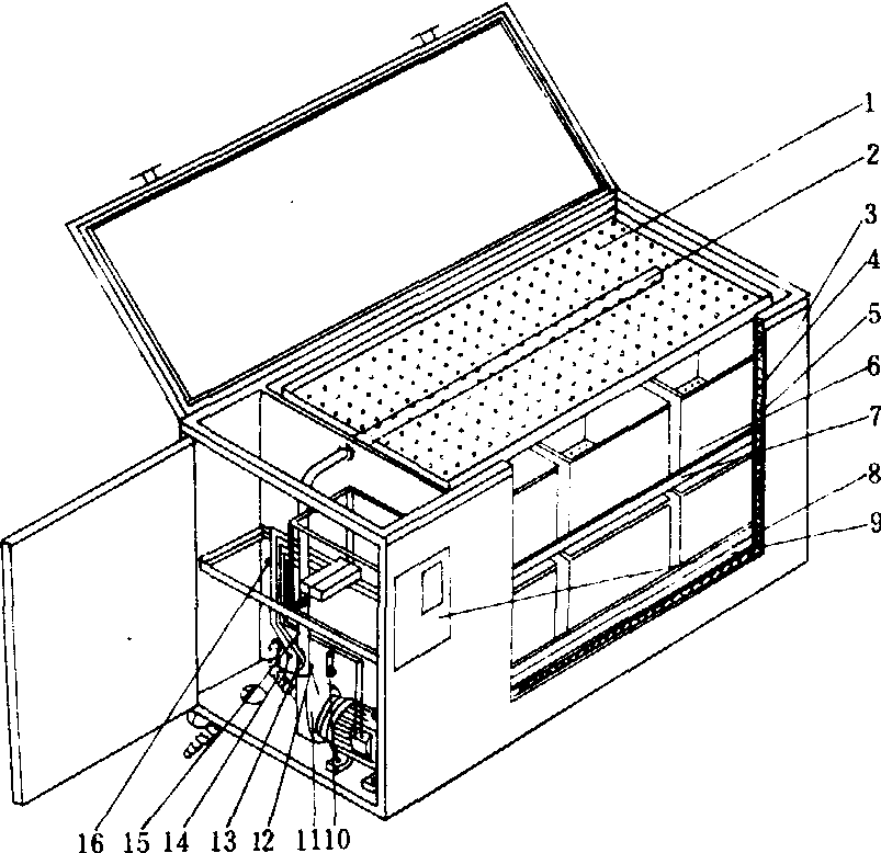 1.淋水盆;2.喷水器; 3.外箱体;4.内箱体;5.保温层;