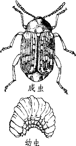 | 释义 | 豌豆象pea weevil钻蛀性豌豆害虫。学名 Bruchus pisorum (Linnaeus)。鞘翅目,豆象科。分布全世界。中国除西藏、黑龙江、吉林、辽宁、内蒙古、新疆、广西、广东等省区外,其他各地均有发生。 豌豆象pea weevilBruchus pisorum L.,昆虫纲,鞘翅目,豆象科。分布于全世界;中国除黑龙江、内蒙古、新疆、宁夏、贵州、广西尚未发现外,其他各省区均有发生。寄主为豌豆。成虫体长4~5 mm,椭圆形,黑色;前胸背板两侧缘中间偏前各有一向后指的尖齿,后缘中央有一近三角形白色毛斑;每个翅鞘中后部均有1条白色毛组成的斜纹。末龄幼虫体长4.5~6 mm,乳白色,多皱纹,背隆起,体弯曲;头小,棕褐色;无背线,足退化。中国一年发生1代,以成虫在仓库内外的缝隙中或包装物中越冬。成虫于次年飞往田间,卵散产在豆荚上。幼虫孵化后蛀害豆粒,随收获贮藏带入仓内,继续取食直至羽化。可采用选育抗虫品种,沸水烫种(烫种时间为25 s),仓库熏蒸,田间成虫盛发期喷药等方法防治。