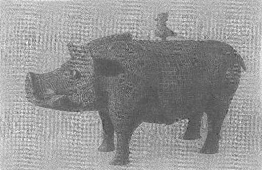 | 释义 | 豕铜尊商。通高40厘米,长72厘米。1981年湖南省湘潭船形山出土。湖南省博物馆藏。尊,古代盛酒器。亦泛指一切酒器。此尊豕形。形体圆肥硕大,站立状,伸颈,口微张,两侧有獠牙外露。眼圆睁,耳竖起。颈上有扉棱象鬃毛。背脊上有一椭圆形口,上一鸟柱盖。前后在偏上方的两侧各有圆形穿孔,内嵌接圆管,可穿绳抬起。面部饰卷曲阴刻的饕餮纹,腹,背饰鳞纹。四足与臀部以云雷纹为底,上饰四道夔纹。此器形体庞大,极为珍异,与现代家猪不同之处,即腹较小些。