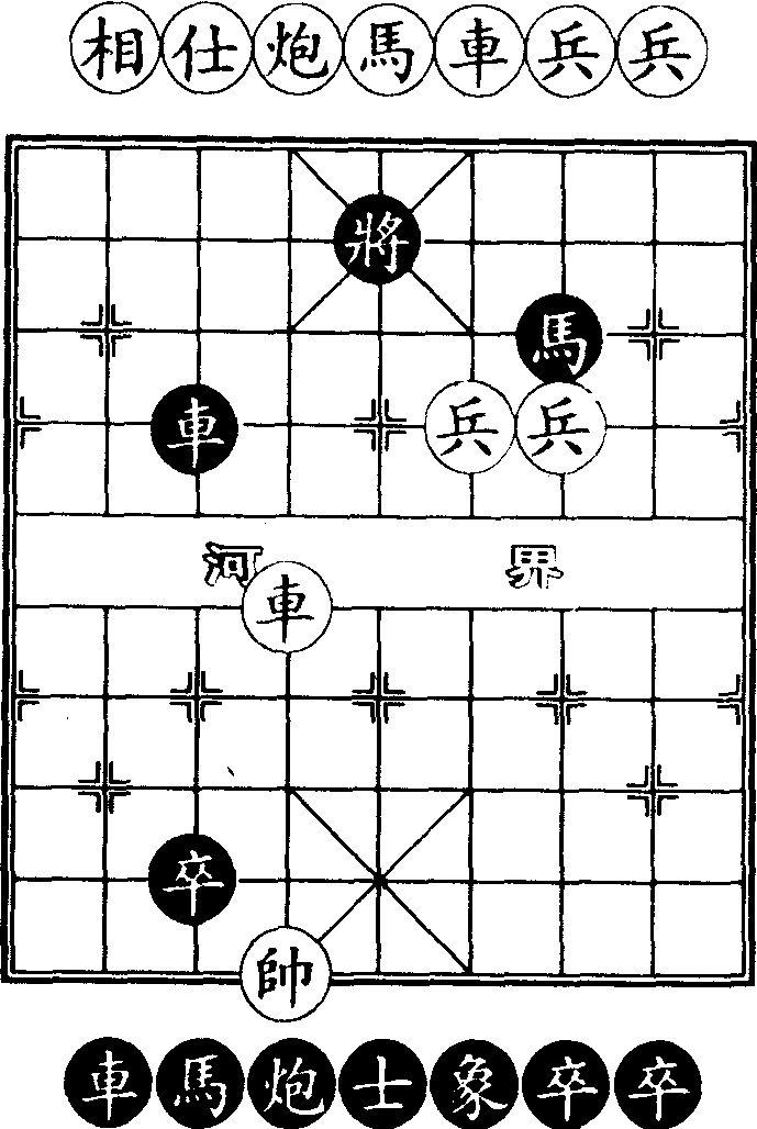 | 释义 | 象棋棋盘和棋子棋盘系由9道纵直线和10道横线交叉组成,在棋盘上形成90个交叉点。棋盘中间没划通纵直线的地方叫“河界”,双方棋局后中部划有交叉线(使4个格划成米字形)的地方叫“九宫”。棋子总共有32枚,分黑、红,各占16枚,各刻有7种名称。红棋子:帅1枚,车(音ju)、马、炮、相、仕各2枚,卒5枚;黑棋子:将1枚,车、马、炮、象、士各2枚,兵5枚。对局开始前,双方棋子放在棋盘上相应的固定交叉点上,行棋时,按行棋规则棋子可走在90个交叉点上,每个交叉点只允许落1枚棋子。