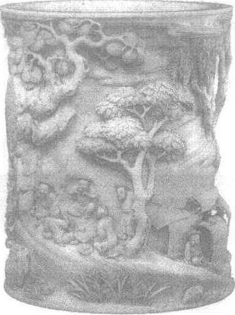 明代制品,现为北京故宫博物院收藏。筒作圆形,高12.7厘米,直径9厘米。线刻装饰,细如毫发,纹内填蓝色。以简洁的手法表现松、竹、梅及奇古、幽兰。筒身还刻有七言诗一首: “问余何事栖碧山,笑而不答心自闲。桃花流水杳然去,别有天地非人间。”