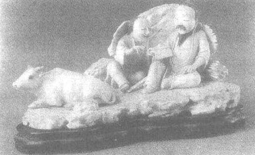 清。高4.5厘米。北京故宫博物院藏。弯曲的草滩上,左伏一牛,右边岩石前,一老一少身背笠帽的牧牛人正倚坐柴捆读书。牧童居左,倾身趋向老者,右手指着书,面带微笑;老者居右,右手持翻卷的书,托于右膝上,露出一副满意的样子。形神颇为生动。
