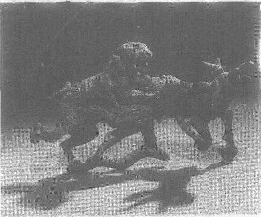 | 释义 | 豹狼争鹿铜扣饰西汉。高7.2厘米,宽12.5厘米。云南省晋宁石寨山出土。云南省博物馆藏。铜扣饰表现了豹、狼为争噬倒地之鹿而凶狠斗杀的情状。一支小鹿已被狼和豹压于地下,它四脚朝天,腹已破,内脏外露,已奄奄待毙,狼的右前肢还紧紧地压着它,而豹的右后腿又狠狠地蹬在狼的右前腿上。为争噬小鹿,豹子口咬狼脊,前爪攀住狼腰,狼则以前爪抵住豹腹,口咬豹的右后腿。最下面的一条蛇,虽践于豹足之下,却以口死死咬住了上卷的豹尾。在诸多表现野兽弱肉强食题材的铜扣饰中,此件表现得尤为淋漓尽致,这不难使我们想向到古代云南的青铜器的铸造者们,他们既是僄悍的猎手,同时又是杰出的艺术家,否则如何能创作出这样具有生命力的作品呢?艺术源于生活而又高于生活,大自然是艺术无尽的源泉,古代云南青铜器之花,不愧为我国青铜铸造业的一支硕硕奇葩。
