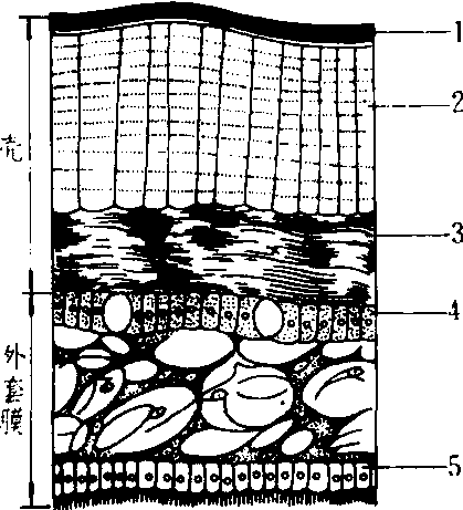 河蚌贝壳及外套膜横切 1.角质层 2. 棱柱层 3. 珍珠层 4.分泌珍珠层的表皮细胞 5.具纤毛的上皮细胞 |