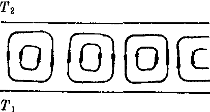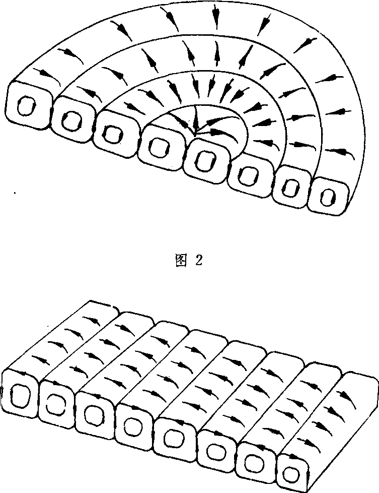 图 1 在各种不同的实验条件下,会形成各种各样的对流花样,当液层上表面是自由面时,也就是流体上表面直接与空气接触,不覆盖任何平板时,从上表面看下来,对流花样呈规则的六边形格子,当流体层被限制在两块圆形的平板之间时,对流花样是呈旋转状的同心圈,若限制在长方形容器中,则对流花样呈平行于长方形短边的蛋卷式样,图2,图3就是这两种情况下对流花样的示意图。贝纳德对流花样是远离平衡的非线性系统,当外界控制参量超过一定的临界值(这里为△Tc)后,由无序结构突变为有序结构的典型例证。