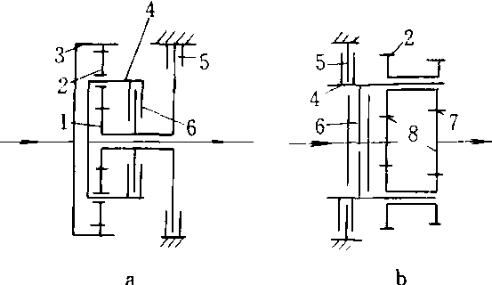 两档负载换档机构 a.内啮合行星式 b. 外啮合行星式 1. 太阳轮 2. 行星轮 3. 齿轮 4. 行星架 5. 制动器 6. 离合器 7. 输出太阳轮 8. 输入太阳轮 |