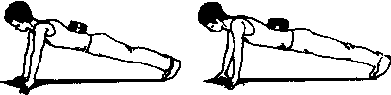 适用于5—6年级。可以发展学生上肢肌肉力量。器材 3—5公斤沙袋或哑铃、杠铃片10个。场地 在操场空地画一条长10—15米的横线。游戏方法 把学生分成实力相等的2或4组, 每组10人。预备时,第一组10人双手按在线上,做直臂俯撑,并在每人腰背部放1个沙袋或杠铃片。教师发出开始口令后,全组同学立即做屈臂俯卧撑。由第二组同学裁判计数,然后交换进行。各组都做完后,以累积数字最高的组为胜。