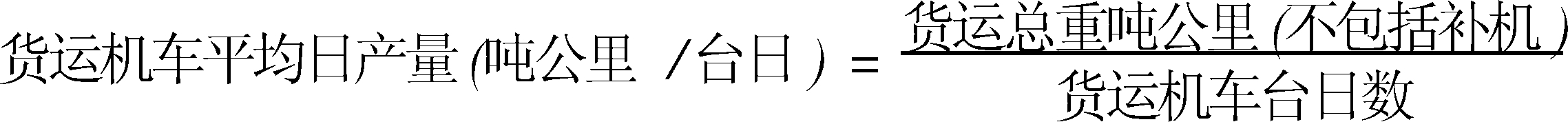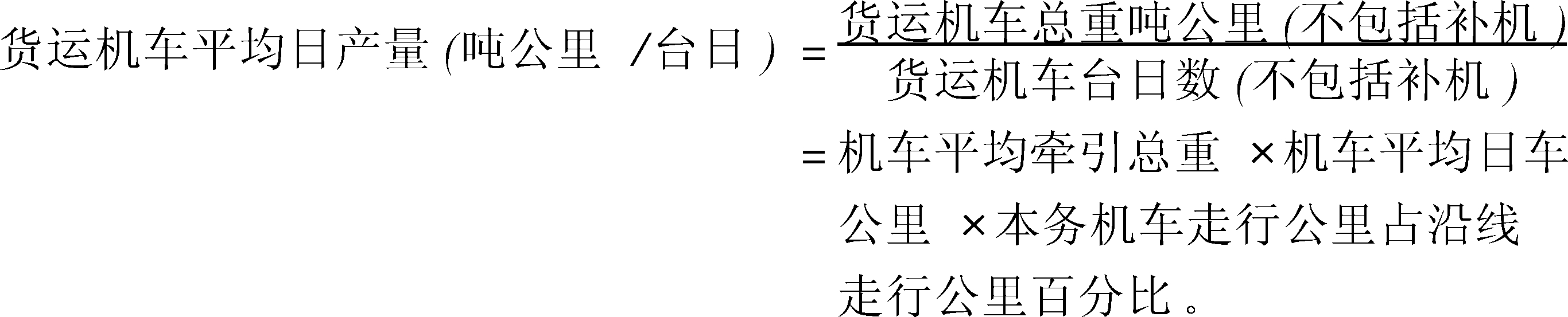 | 释义 | 货运机车平均日产量freight locomotive gross ton-kilometers per locomotive day简称“机车日产量”,又称“货运机车生产率”。平均每台货运机车在一昼夜内完成的总重吨公里数。从货运机车在时间和牵引能力的利用两个方面,综合反映货运机车运用效率的指标。其计算公式为: