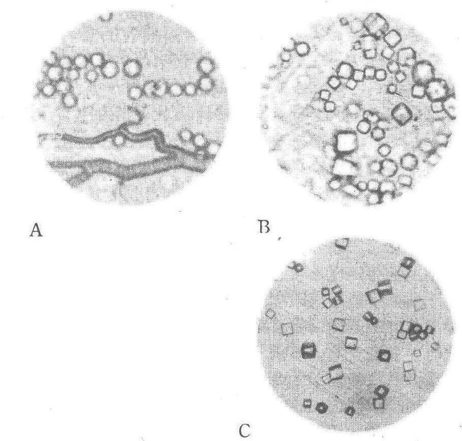 图 1 质型多角体病毒粒子 16~30%,总分子量为14.6×106,其编码为R/2: ∑13/25∶SO/S∶1/0。质型多角体病多角体是1种蛋白质晶体,其内包含着大量病毒,表面附有游离病毒。多角体通常为六角形,长宽为0.5~10微米,也有四角形和三角形(图2)。病毒的稳定性与病毒所处的状态及环境有密切关系,在多角体内的病毒比游离病毒保持活性的时间要长得多; 在干燥状态下,质型多角体病毒于1年后还保持相当的活性,有时4年后还不完全失活,但遇高温容易失活。质型多角体病毒在0℃以下保存时,致病力几乎不变,在普通蚕室条件下,致病力至少可保持3~4年。在25℃2%甲醛的石灰饱和液中浸渍20分钟;在20℃有效氯0.3%的漂白粉溶液中浸渍3分钟;在25℃1%石灰浆接触5分钟以及在比重1.06克/厘米3的盐酸44℃中浸渍3分钟,都能使质型多角体病毒失去传染性。100℃湿热经3分钟和日光直晒经10小时也能使质型多角体病毒失去传染性。