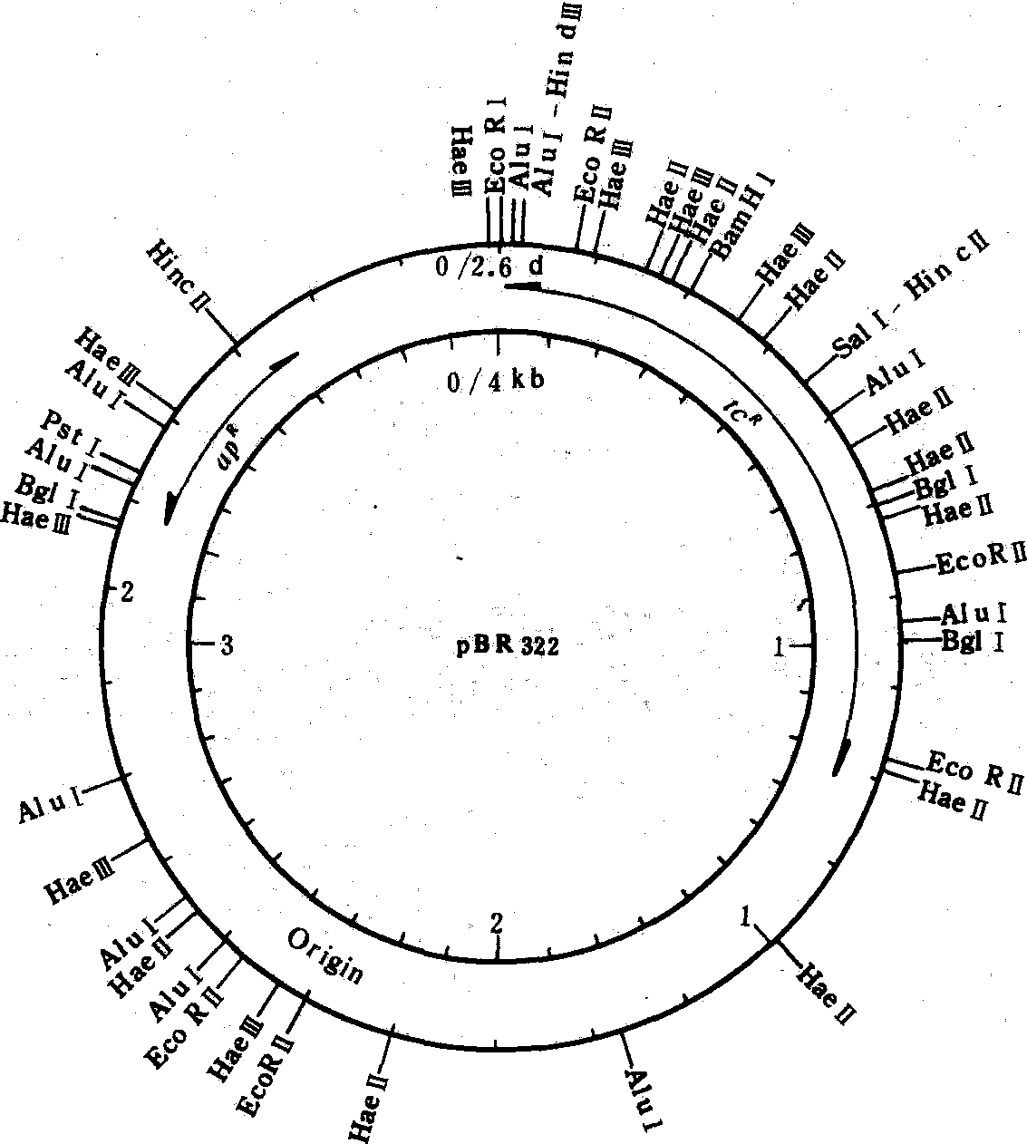 大肠杆菌质粒pBR322的结构示意图 里圈表示长度(kb),外圈示分子量(d)及各种限制酶的识别位点apR: 氨苄青霉素抗性基因; tcR: 四环素抗性基因; Origin: 复制起点