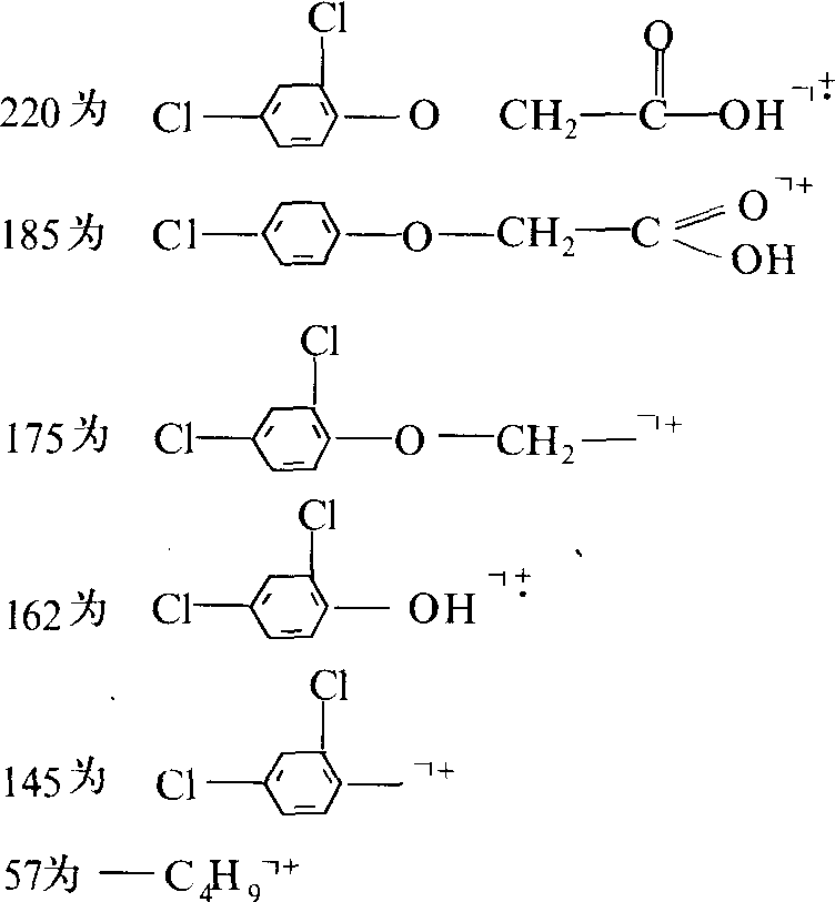 应用 质谱计主要用于化合物结构鉴定,在一定条件下可作定量分析。 化合物结构鉴定 分子离子的稳定程度和断裂方式与分子结构有关。在一定条件下待测物分子能形成与其结构相关的特定离子组成构型,这是化合物结构鉴定的依据。图2为2,4-滴丁酯的质谱图。质荷