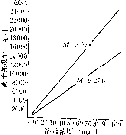 定量分析 在一定条件下,待测物分子所形成的离子强度与进样量呈线性关系,这是定量分析的依据。选择待测化合物质谱中某一特征性离子 (例如2,4-滴丁酯质谱中M/e=276的离子)作为被检测离子。配制不同浓度的标准溶液,进行质谱操作,绘制标准溶液浓度与离子强度曲线。图3为2,4-滴丁酯的溶液浓度与离子强度标准曲线。在相同条件下取待测样品溶液进行质谱操作,得到被检测离子的强度值,在标准曲线上查出相对应的浓度,从而计算出样品中待测组分的含量。
