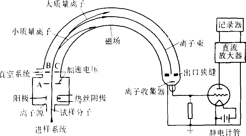 类型和基本构造 质谱计有多种类型,以适应于不同的用途。按照质量分析器的不同,可分为磁偏转质谱计、四极矩质谱计、飞行时间质谱计和双聚焦质谱计等。质谱计的基本组成为:进样系统、离子源、质量分析器、检测及记录系统、真空系统、电源及控制系统。其中离子源被视为质谱计的“心脏”。图1为一半圆形磁偏转式质谱计示意图。样品通过进样系统导入离子源,在高能电子的轰击下形成带电正离子,离子通过加速区加速后进入质量分析管,在磁场的作用下被偏转分离,通过出口狭缝到达收集极,经放大记录,即得到质谱图。
