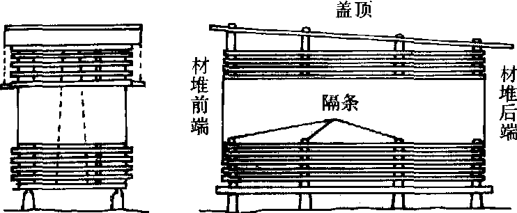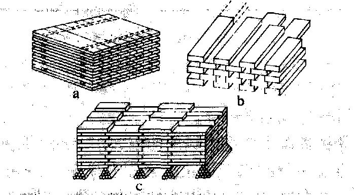 垛积区划分 按垛积锯材的树种、材种和尺寸,可分为中薄板区、枕木(特大方)区、特殊材种区、小规格材和次材区等。为方便装运,对体积和容重较大的材种,如枕木、罐道木、机台木等,一般都在靠近专用线或其他运输线一侧设置垛积区。中薄板在高含水率情况下,水分蒸发面大,宜在场区边缘位置垛积。容易产生开裂、变形缺陷的硬阔叶树锯材的垛积区,一般都设在背主风方向或场区中央。 场区道路布置 视场地面积大小、分区多少、场地运输方式等具体情况而定。采用有轨平车运输,纵道宽度一般为2~3米,但考虑防火需要,应另外加宽3~5米。采用叉车、跨车等运输设备运输,道路宽度在10~12米左右即能满足运输和防火需要。纵向通道以南北向并保持与主风向平行最为适宜。横道,其宽度可在5~8米范围内选定。 贮材场作业 按作业程序可分为锯材分类和合理垛积。 锯材分类 对运进现场的锯材,按不同树种、尺寸、等级进行分类。 合理垛积 将各类锯材按指定的垛积区,分别采用相适宜的垛积方法进行垛积。垛积方法,随场地自然条件和锯材的材种、尺寸及贮存期长短等情况而异,一般分为平垛、竖垛、密实垛、通风垛、纵横交错和三角交叉等垛积方法。❶平垛:又称层积垛。即将锯材分层与地面平行进行垛积。从垛底第一层起,按规定横向依次铺放,板与板之间留一定间隔,然后90°交叉再依次铺放第二层,如此交叉垛积,直到预定高度为止,最后加盖封垛(图1)。此种垛积方法应用比较广