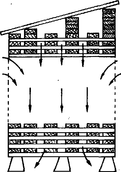 图2 通风垛积法 垛堆基础设置 正确选择设置垛积基础,是锯材垛积作业的重要前提。垛积基础分固定式和移动式两种。❶固定式基础:适于垛积期长、材种不经常变换的锯材或垛积在低洼潮湿场地设置时采用; ❷移动式基础:具有随意变动基础的位置和调整基础的间隔、距离的特点,最适于在地势平坦、土质坚实的场地条件设置使用。 垛堆气流循环 空气在垛堆内部循环流动效果好坏,直接影响锯材天然干燥周期的长短和保管质量的好坏。在锯材垛积作业中,通过合理地设置垛基高度及通风口的大小,调节空气在垛堆内的流动效果。垛堆的空气分水平和垂直两个方向流动。水平方向流动是在外界风力的作用下形成的;垂直方向流动是借助合理配置垛堆通风口和正确选用垛堆基础高度等措施来实现。白昼外界温度高,热空气从垛堆顶部及侧面进入垛堆内部与锯材表面接触吸热后,水分开始蒸发,空气温度逐渐降低,随着空气的比重增加,水平方向流动减弱,在通风口作用下,构成垂直气流,最后由垛堆底部流出(图3);夜间,大气温度比垛内下降得快,垛内温度比垛外高,外界冷空气经垛堆基础底部流进垛内,迫使垛内热空气经垛堆顶部向外流出,由此而使空气在昼夜温度差作用下形成反复的循环流动。冷热空气在垛内循环流动过程中,不断使木材蒸发的水分排出垛外而逐渐变干。