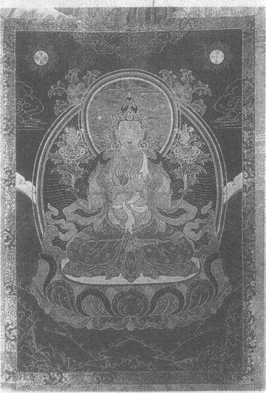 | 释义 | 贴花加绣弥勒佛像清。纵152厘米,横101厘米。西藏自治区拉萨市布达拉宫藏。此幅以蓝色为背景地,中央弥勒佛像,趺坐于宝座之上,头戴高冠,柳眉微垂,手捻两朵花枝,四周有佛光,左右对称绣日、月。这幅贴花加绣的弥勒佛像,用彩色绫子剪贴,加绣勾勒线条而成。背景部分是直接用丝线和金线绣成,佛像用贴花法绣成,佛光用钉金线绣成,日月用平金法绣成。构图庄严富丽。“弥勒佛”,是梵文Maitreya的音译,意译慈氏,佛教菩萨名,佛家称弥勒。佛教传说,从佛受记(预言)将继承释迦佛位为未来像(“当像”)的菩萨。据《弥勒上生经》和《弥勒下生经》载,原生于婆罗门家庭,后为佛弟子,先佛入灭,上生于兜率天内院,经四千年(据称相当于人间五十六亿七千万年)当下生人间,于华林园龙华树下成佛,广传佛法。