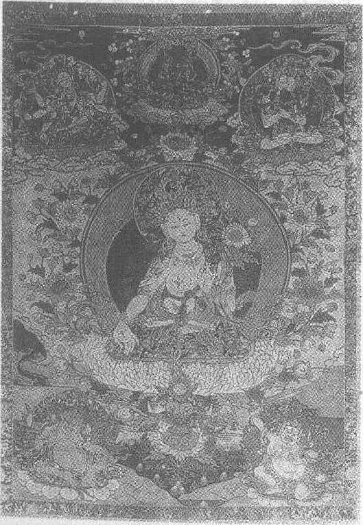 | 释义 | 贴花加绣白度母像清。纵120厘米,横82厘米。西藏自治区拉萨市布达拉宫藏。“度母”亦称“救度母”、“多罗母”等。藏传佛教女神名,传说为观音化身的救苦救难本尊,以颜色区分,现有21相,以白度母、绿度母最为常见。此幅中间人间界以淡蓝为地,中央白度母跏趺坐,姿态婀娜,头戴宝冠,广鼻阔耳,微张的双眼显露出超脱、飘逸的神态,浅色的肌肤以淡淡的晕色来烘托,上眼睑和直鼻梁上提以浅粉,使其形象轮廊更加鲜明丰满。四周有佛光及鲜花环绕。上方天界以深蓝色为地,有三个姿态雍容华贵的三大天神。下方地界以浅绿色为地,有二个怒目的地神。此贴花是用各色绫子及织金缎,幅外用织金缎及织金妆花缎装裱,气派庄严,豪华富丽。