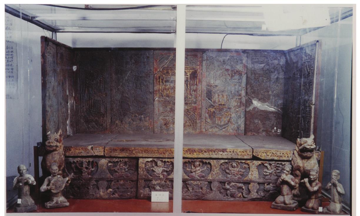 | 释义 | 贴金彩绘屏风石棺床唐代文物。1982 年 6月秦城区石马坪一隋唐古墓葬内出土。通高 1.23米,宽 1.15 米,长 2.18 米。石棺床由大小不等的 17方画像石和 8 方素面石条组成,分为床座、床板和屏风三部分。床座正面由两方画像石拼成,上面凹雕 6 组壶门,分上下两层。上层壶门为圆底莲瓣形,内有 6 个男性乐伎,均头戴束发冠,身着圆领紧袖左衽绯衣,两肩垂带交叉飘起,从左到右依次为执笙俑、执铜钹俑、弹琵琶俑、吹洞箫俑、手击腰鼓俑和双手弹奏竖箜篌俑。下层壶门内与,亡层乐伎上下对称雕刻 6 个神兽,两臂生翼,反掌用力向上托举,双腿弯曲呈下蹲状态。床板由四块石条拼接而成,各石条之间均以子母扣组接,正面床沿镌刻连珠忍冬纹,并饰以金彩。其余三面距床边沿处凿刻有凹槽。槽上置立屏风,为该石棺床最有价值的部分。屏风共有 11 块,采用平地减底的雕刻技法,雕工精湛,内容丰富,主要反映主人狩猎、宴饮、出行、泛舟等生活场面和亭台楼阁、水榭花园等建筑物体。部分画像石饰以红彩,外施贴金,十分华丽。