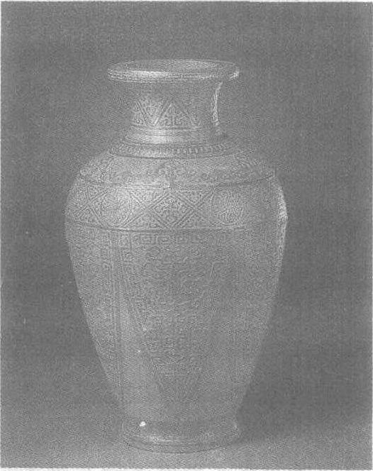 | 释义 | 贴黄蕉叶兽面纹瓶清乾隆。高29厘米,口径9.9厘米,足径9.4厘米。北京故宫博物院藏。盘口、长颈、鼓腹瘦长,圈足外撇。壶体遍饰花纹,由本色贴黄上粘贴深色竹黄雕刻而成。自口沿外侧向下,分别以三角形、菱形和蕉叶形组成图案的基本轮廓,内填如意云头、团菊、兽面、回纹、蝉纹等纹饰,色泽明丽,作工华美,是一件著名的贴黄工艺品。贴黄见“贴黄蕉叶纹长方盒”条目。