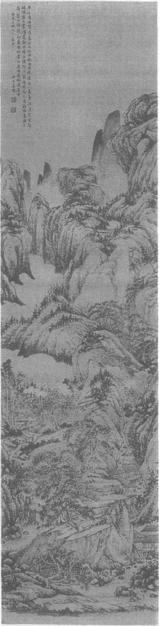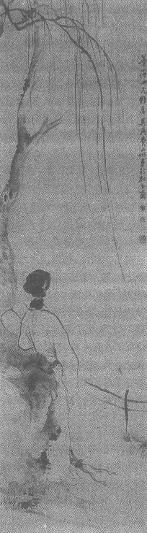 | 释义 | 费丹旭秋风纨扇图轴清。费丹旭绘。纸本墨笔。纵149.8厘米,横44.5厘米。上海博物馆藏。费丹旭(公元1801—1850年),字子苕,号晓楼,晚年号偶翁,又号环渚生,乌程(今浙江吴兴)人。曾卖画于江、浙两省,青、中年时居杭州时间较多,晚年寓居上海,终于沪寓。擅长写照,所作肖像画,传神生动,名噪一时。尤精仕女画,笔法秀润,设色淡雅。偶作山水、花卉,清灵秀雅。工书,善诗,著有《依旧草堂遗稿》。此幅是费丹旭仕女画的代表作品。墨色疏淡,补景得宜,意境深远。采用墨笔写意的画法,描绘了一位手执凉扇背立于秋风中的妇女。她倚石而望,左前方一株高大的柳树,光秃的枝条从画面上方无力的垂下,在微风中摇曳,喻示着秋的来临。她面前有几根栏杆,而栏杆外却是空茫一片,不由引人联想,她在看什么?是水影?还是落花?是远处的山?还是浮动的云?富有动感的线条勾出了简单的衣衫,表现了夏衣的轻薄;浓润的墨块点出了头发。仕女画的题材在清代得到了很大的发展。在继承传统的同时,更多的趋向于文学性。这类秋风思归的题材便是文人画家所经常表现的。费丹旭的这幅画无疑是这类题材作品中的佳作。画中疏落的柳枝、人物的背影以及时过景迁却仍持在手的凉扇和栏杆外的一片空茫无不使人感到淡淡的秋意,通过简静而巧妙的构图,准确地表现了主题。