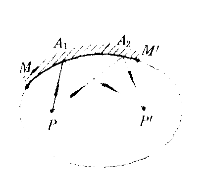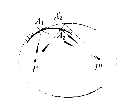 图1 从最短光程可导出光在均匀媒质中沿直线传播、光的反射定律和折射定律这三个几何光学的基本实验定律。如图2示,当反射镜面是旋转椭球面,而光源置于一焦点上,则不论光的入射点在A1或A2……,反射光线总是通过另一焦点。这是光程恒定的例子。如果反射镜面内切于一椭球面上的A1点,那么,只有光经PA1反射才通过另一焦点P′,这时有最大光程。费马原理的基本思路,启发英培督在1744年提出质点运动的最小作用量原理,进而启发L.V.德布罗意发展了物质波的理论。