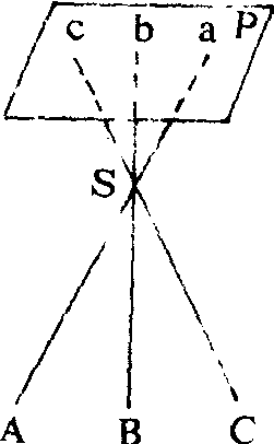 | 释义 | 中心投影zhongxin touying空间任意直线均通过一固定点(投影中心)投影到一平面(投影平面)上而形成的透视关系。如图所示,s为投影中心,p为投影平面,SA与P的交点a为空间点A的中心投影。