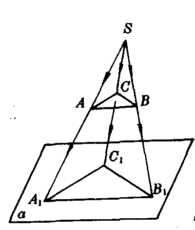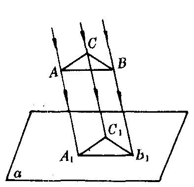 图2 投射线互相平行(或看作投射中心在无限远处)的投影叫做平行投影.作出平行投影的方法叫做平行投影法.如图2,△A1B1C1就是△ABC以AA1为投射方向在平面a上的平行投影. 平行投影有以下基本性质:❶不平行于投射线方向的线段的投影是线段. ❷不平行于投影线方向的两条平行线段的投影仍是平行线段或共线线段. ❸投射的比等于原线段的比. |