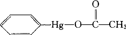 | 释义 | 赛力散PMA又称醋酸苯汞。有机汞杀菌剂。化学名称:醋基苯汞。化学结构式如下。原药白色结晶,室温下水中溶解度0.18%,可溶于乙醇和苯,在常温下有微挥发性。种子处理剂,可杀死种子外部的病菌,亦可与细土混匀成毒土作林木苗床的土壤处理,防治立枯病、根腐病。对人畜毒性大。对大鼠急性口服LD5035 mg/kg,由于毒性和污染环境,已禁用。