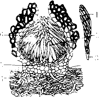 赤霉属 1. 子囊孢子 2. 子囊 3. 子囊柄 4. 菌丝体5 . 子座 6. 子囊壳 |