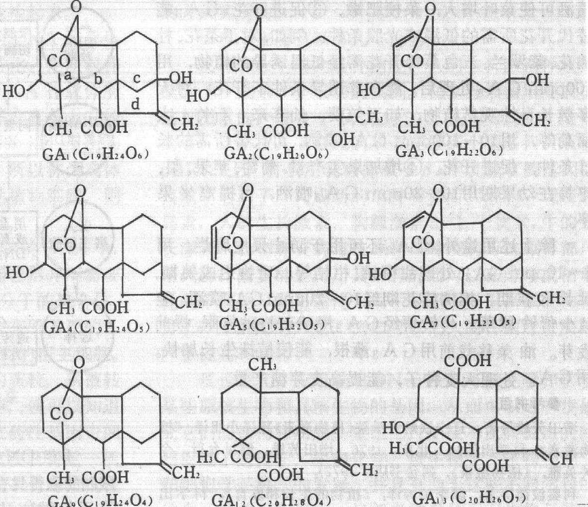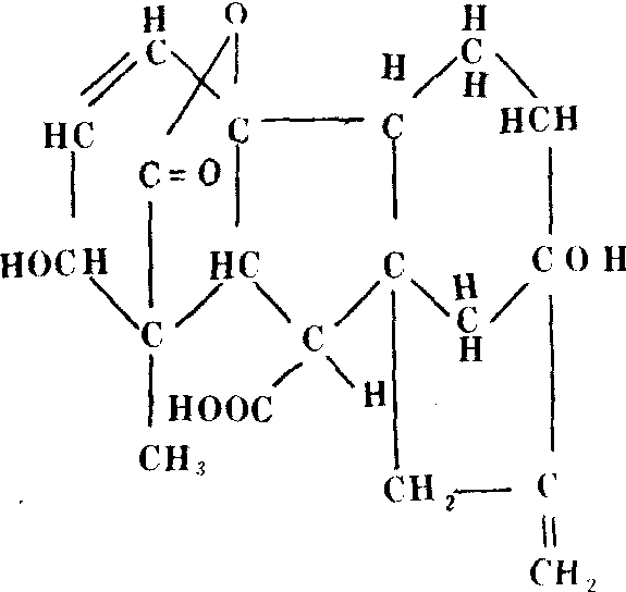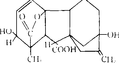 图543 赤霉酸(GA3)的结构式 赤霉素gibberellins植物体内普遍存在的内源激素,属贝壳杉烯类化合物。又名九二○、赤霉酸(gibberellic acid)。化学结构式: