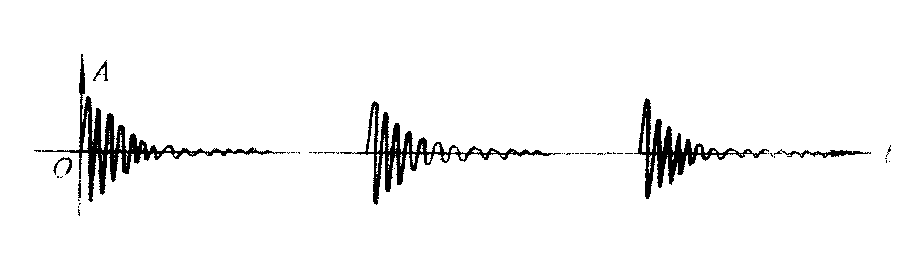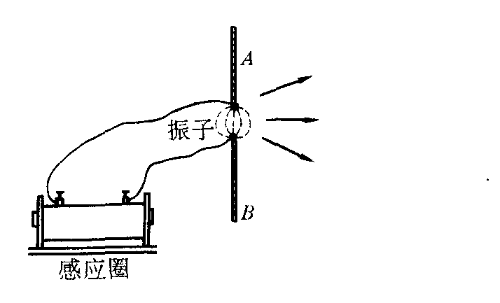 图1 由感应圈得到的高电压加到离一定距离的两个金属球上,当电压足够高时,两金属球间的空气被击穿,出现火花放电,两球间的炽热空气变成良导体,整个电路形成偶极振子并按电路固有频率振荡。由于电路的L、C值小,振荡频率很高(赫兹于1888年的实验中约为108~109赫)。由于存在电阻,振荡为减幅振荡。振荡结束,感应圈又一次给金属球充电,再击穿、再振荡,形成间歇阻尼振荡,如图2所示。
