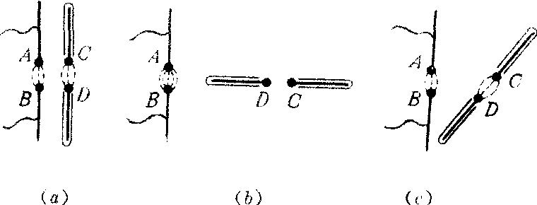 图2 如果在偶极振子AB附近另放一个不接感应圈的偶极振子C、D,且其外层装有套子,用来调节C、D的长度,调节C、D套子的长度,以改变C、D的电感和电容,使其固有频率等于A、B振子的振荡频率。当A、B击穿产生电磁振荡时,若如附图3(a)使C、D与A、B平行,发现C、D两球间的空气被击穿,C、D间有火花跳过。