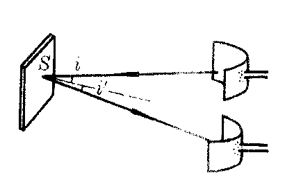 图4 图4显示了电磁波的直线传播,使两个抛物柱面镜相对,当左边偶极子火花振荡时,右边共振偶极子也出现火花。若当中放一导体板,则共振偶极子火花立即消失。赫兹还做了电磁波在金属表面反射的实验,如图5所示,其反射角i′等于入射角