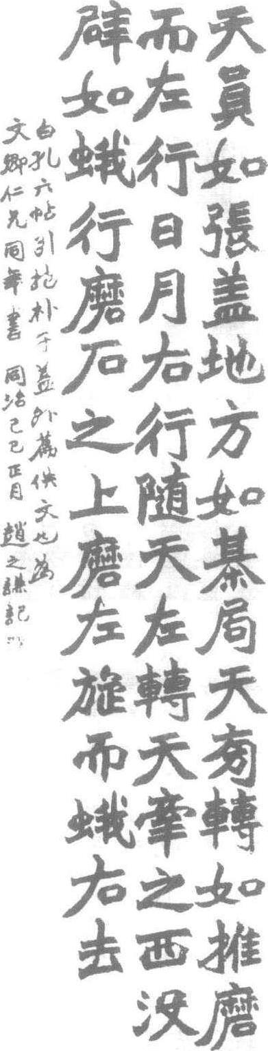 二金蝶堂双钩两汉刻石之记 清·赵之谦 赵之谦1829—1844字㧑叔, 号悲盦, 浙江会稽人。咸丰举人,历官江西奉新、南城县令。书法、绘画、篆刻卓绝 一时。他的书法最早是从颜体入手,笔力雄浑,落笔不俗。后读阮元《南北书派论》、《北碑南贴论》而知学颜终难以成家,乃改学魏碑,尤其对《龙门造像》、《张猛龙碑》、《郑文公碑》、《瘗鹤铭》等有精深的研习。赵之谦在演习北碑的基础上,将颜体的劲健和二王书法的流便妍美融会其中,形成了他的魏体楷书新面目,人称“颜底魏面”。这种新魏楷书法,用笔方圆兼施,而以圆为主,形成一种外圆内方的结构特征。赵之谦的篆书和隶书师法邓石如,而能够广泛学习秦汉碑刻,形成自己的风格。他的篆书较之邓石如,更显活泼自在,隶书中也参入魏碑的 一些笔意,显得闲雅温润,结体用笔时出新意。