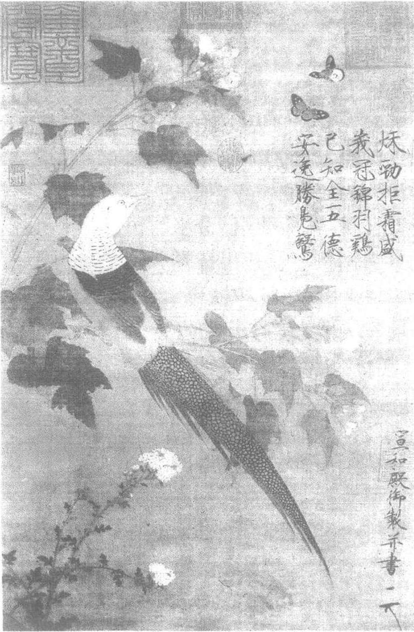 | 释义 | 赵佶《芙蓉锦鸡图》立轴、绢本,设色。画卷中一羽冠绚丽的锦鸡高傲地栖息于芙蓉花盛开的枝干上,昂首与半空中两只翩翩起舞的蝴蝶对视。一枝清幽的菊花从画面左下角斜伸出来,增添了秋的意境。右上有宋徽宗题“秋劲拒霜盛,峨冠锦羽鸡。已知全五德,安逸胜凫鸥”。由此可见画中物象被赋予 一定的象征意义。锦鸡被看作是具有 “文、武、勇、仁、信” 五德的儒家道德象征; 而当时安逸的生活胜过了以往的太平盛世。这种借花鸟寓意,宣扬伦理纲常,粉饰太平的作画风格在当时院体画中经常出现。