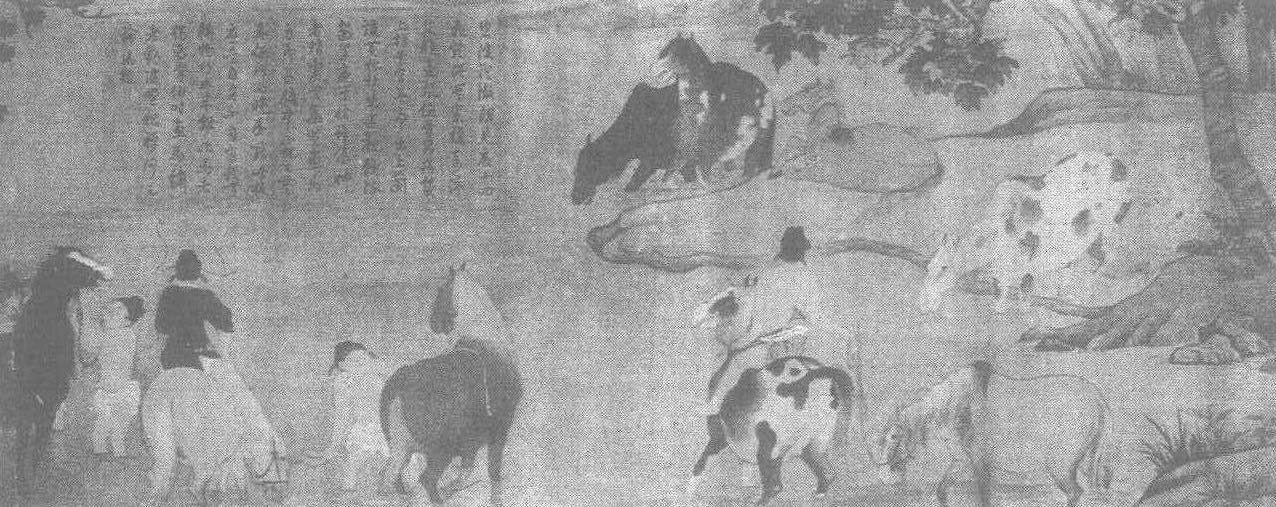 | 释义 | 赵孟頫浴马图卷元。赵孟頫(见《赵孟頫秋郊饮马图卷》条目)绘。绢本设色。纵28.1厘米,横155.5厘米。北京故宫博物院藏。图中一湾溪水清澈见底,两岸绿草如茵,杂生几杆芦苇。梧桐、垂柳叶色浓郁,翳荫蔽日,不见一丝风动的迹象。光色明朗,显示出一幅夏日正午的景色。14匹骏马,颜色不一,分黑、白、灰、褐、花斑诸种,膘肥体壮,有的饮水,有的嘶鸣,有的卧在岸边,有的立于溪中,俯仰顾盼,神态各异。九个奚官或少或长,多数人脱去了官服,赤膊下水。一些人刷洗马身,另一些人则骑在马上趟水而行,还有的人在树下纳凉,一个老者衣装齐整地牵马走向水边。画面形象左右呼应,动静结合,用笔工细,线条圆劲,色彩鲜明,风格秀丽,有唐人遗风。画中款署:子昂为和之作。下钤〈赵氏子昂〉、〈松雪斋〉印。引首有清乾隆帝题:“青溪龙跃”四字。卷尾有明人王穉登、宋献题跋。经由明王穉登,清高士奇及清内府收藏。《江村销夏录》、《石渠宝笈续编》、《式古堂书画考》著录。