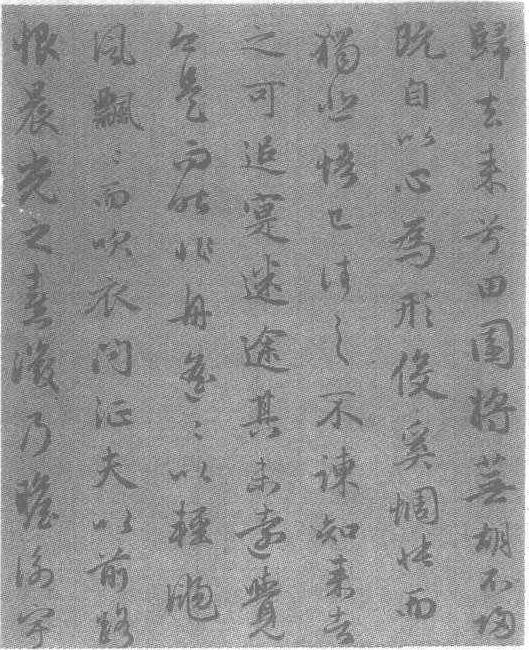 | 释义 | 赵孟頫行书归去来辞卷元。纸本。纵24厘米,横1462厘米。辽宁省博物馆藏。赵孟頫(见《赵孟頫行书求友赋册》条目)书。《归去来辞》是陶渊明在乱世之时,不欲从仕,安于隐居生活的作品:“归去来兮田园将芜胡不归既自以心为形役奚惆怅而独悲悟已往之不谏知来者之可追寔迷途其未远觉今是而昨非舟遥遥以轻扬风飘飘而吹衣问征夫以前路恨晨光之熹微乃瞻衡宇”。赵孟頫很喜爱陶的这篇力作,故常常书之。赵氏行书运笔间架有王羲之笔意,而“夫”、“其”等字近《兰亭》用笔圆转酣畅,起笔藏露交错,运笔迟缓分明,收笔钝锐错落,清雅遒媚,结体匀净精谨,虽字字独立,但气韵相贯。通篇写于乌丝栏中,是赵氏50岁以后之作。