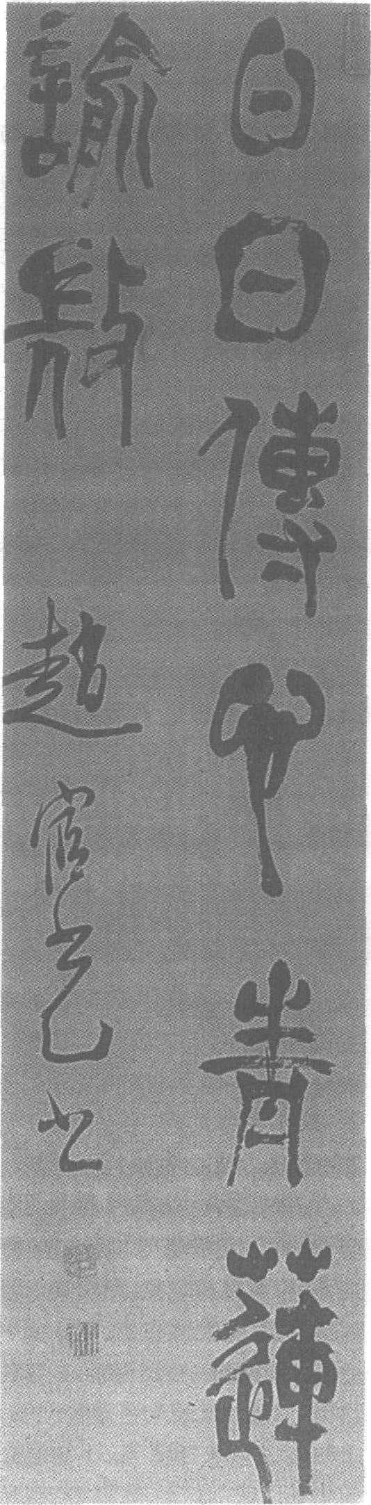 | 释义 | 赵宦光篆书綦母潜诗句轴明。纸本。纵120厘米,横31.4厘米。上海博物馆藏。赵宦光(嘉靖三十八年—天启五年,即公元1559—1629年),字凡夫,又字水臣,号广平,又号寒山子、卜居寒山,江苏太仓人。与妻陆卿子(陆师道女)隐居于寒山。足不至城市,夫妇皆有名于时。宦光读书稽古,精于篆书,开创以一种草书笔法写篆字的体式,世称“草篆”。著有《说文长笺》、《六书长笺》、《九圜史图》、《寒山帚谈》、《牒草》、《寒山蔓草》等。《明史》卷二八七附《文苑·文徵明传》后的《陆师道传》中有他的记载。此幅篆书写唐綦母潜《宿龙兴寺》五言律诗中的五、六两句;“白日传心,青莲谕微。”(录文比原句各节少一字,上句略去句尾“静”字,下句略去句中第四字“法”)。款署“赵宦光书。”款下钤白文<赵宦光印>、<凡夫>两印,起首钤朱文<小宛堂>长方印。书法介于篆隶之间,笔划略带草书笔意,从整体看显得自然质朴,气势连贯不拘,拙中藏巧。