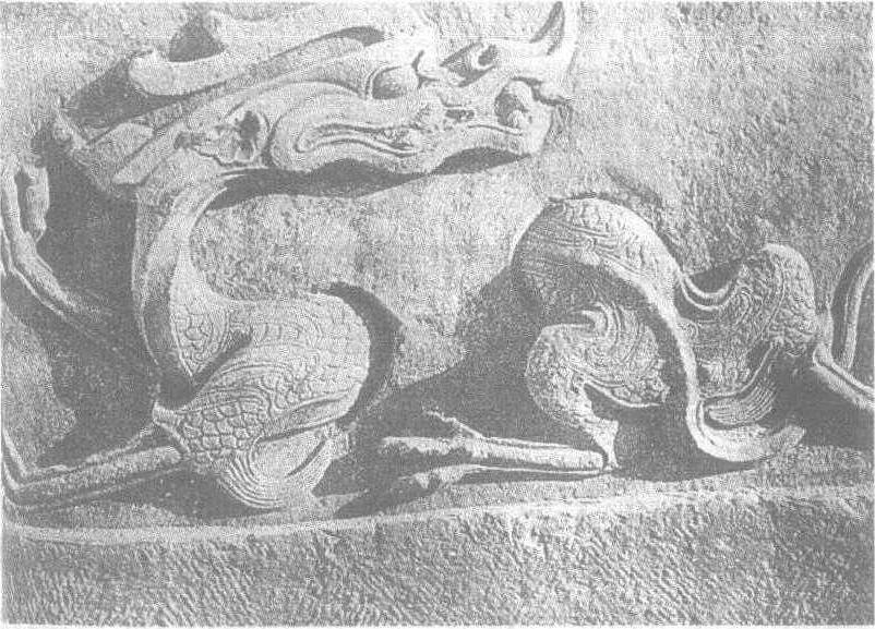 赵州桥栏板浮雕 赵州桥,全长50.82米,跨度37.47米。石桥两端各有两个 一大一小的拱券。这种大拱套小拱的设计,不仅减少了汛期洪水对桥身的冲力、减轻大拱券的负荷与整个桥身重量,而且造型美观,一条弧线横跨河面,宛若长虹从天而落,真乃桥梁建筑艺术之创举。 在局部处理上也别具匠心,在桥身两侧栏板上装点着许多游龙出水、二龙戏珠等浮雕图案。当你从桥面走过,仿佛进入了 一个龙的世界。这件栏板浮雕表现了蛟龙出水的磅礴气势。作者以多变的浮雕手法,巧妙地表现了龙在岩壁间的穿行、飞腾,好像蛟龙在水中翻腾,遨游,从而引起人们的艺术联想。这种大胆的构思和娴熟的雕凿技法,使人叹为观止。《广雅》云: “有鳞曰蛟龙”,蛟龙是 一种能兴云作雨的神异动物。以龙为主题的栏板雕饰,想必有赞美龙的雄威、祈求神保护的美好希冀。 |