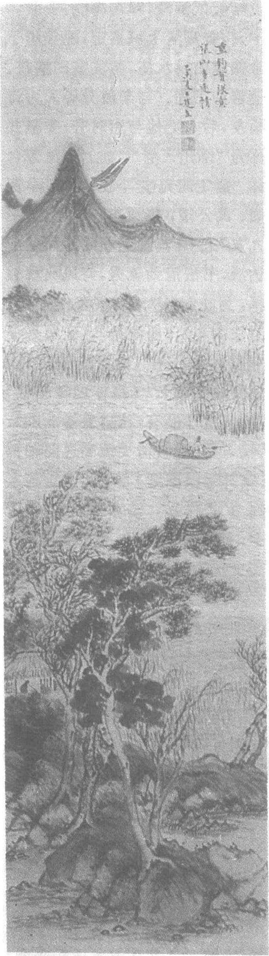 | 释义 | 赵左仿王蒙山水图轴明。赵左绘。纸本设色。纵132.3厘米,横38厘米。北京故宫博物院藏。赵左(公元16—17世纪),生卒年不详。字文度,上海松江人,“松江派”(又称“华亭派”)主要画家之一,“苏松派”的首要人物。工山水,宗董源,兼学倪瓒、黄公望,且受业于宋旭,特征是善用焦墨干笔,长于烘染。他与董其昌关系十分密切,常为董代表,其传世作品有《烟江叠嶂图轴》、《山水轴》、《山居闲眺图轴》、《仿巨然小景图轴》等。这是一幅颇具王蒙遗意的作品。近景坡坨矶石垒垒,杂树丛生,茅舍中端坐一人。中景碧波万顷的江面上,芦荻成片,一叶扁舟荡漾水中,垂竿钓鱼的老翁悠闲地坐于船尾,回首眺望。远处的山峦若有若无地飘浮于云雾间。淡雅的设色,清秀的画风形成广袤旷远、淡泊宁静的意境,令人心神驰往、回味无穷。图的右上角自题“垂钓有深意,望山多远情。己未夏日赵左。”下钤白文〈赵左之印〉、〈文度氏〉二方印。
