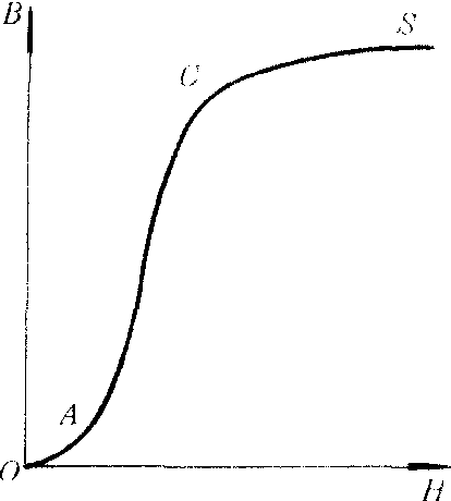 | 释义 | 起始磁化曲线qishi cihua quxian铁磁质从完全未磁化状态(M=0,B=0,H=0),在方向不变数值作单调增加的磁场中磁化直至达到饱和状态过程中磁化强度M或磁感应强度B与磁场强度H的依赖关系的曲线(M—H曲线或B—H曲线)。由于铁磁质中一般M比H大得多(102~106),所以B=μ0(H+M)≃μ0M,因此B—H曲线的形状与M—H曲线的形状差不多。起始磁化曲线是过原点的非线性曲线(见图),B(或M)随H增大而增大,铁磁质中M的值一般远大于弱磁性物质中M的值,而且M很易达到趋近饱和状态。如图示