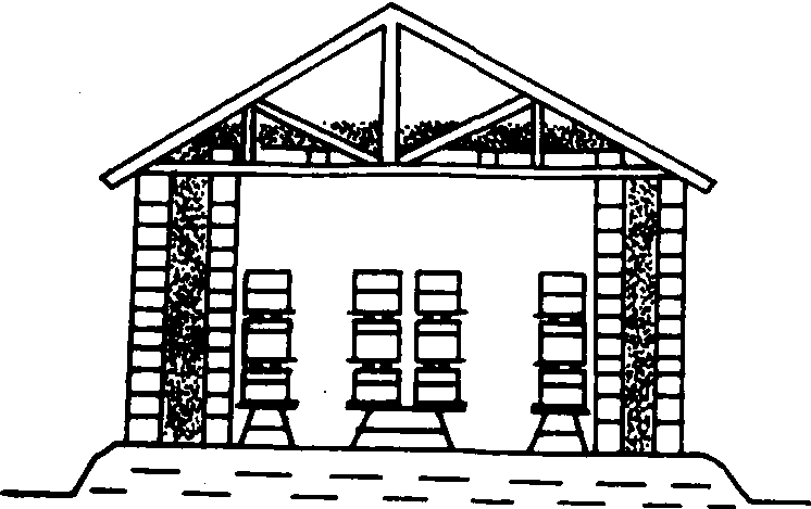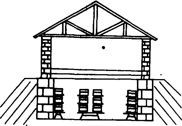 图2 半地下越冬室 全地下越冬室 适用于地下水位低的严寒地区。四周是坚固的单层墙壁,天棚上装填保温物,或在上部建有不影响蜂群越冬条件的地上建筑物。进气孔从室门下方或其他部位以管道形式伸入室内各出口。(图3)