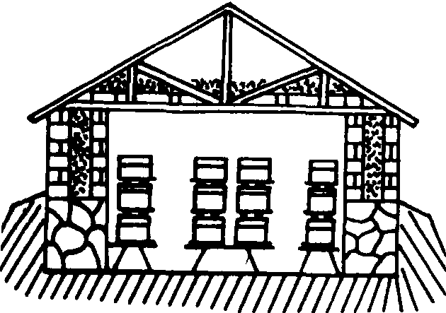 图3 全地下越冬室 上述三种越冬室的室内长度根据放置蜂箱个数而定;宽度根据放置蜂箱的排数而定:两排蜂箱为270厘米,四排蜂箱为480~500厘米;高度均为240厘米。通气孔的大小可按每群蜂6平方厘米计算,并设置可调节活门。在越冬室内有固定的蜂箱架,架高40~50厘米,架上放三四层单箱体。蜂箱排间留有人行通道。在室内不同位置安放温度计和湿度计,通过调节进出气孔控制温湿度。随着现代科学技术和养蜂生产的发展,70年代已出现自动控制调温、调湿的越冬室。 越冬室wintering bee house供蜂群安全过冬的建筑物。常见的越冬室有地上、半地下和地下越冬室3种,分别适用于地下水位较高的寒冷地区、地下水位较高的严寒地区和地下水位较低的严寒地区。越冬室大小依蜂群数量而定,一般每个10框群需0.5~0.6 m3;室内温度保持在0~2℃,相对湿度保持在75%~80%,并能保持黑暗、通风;能防雨、防潮和防鼠害。采用越冬室,可使蜂群安静过冬,减少饲料损耗,有效地保持蜂群实力,但宜防伤热。 |