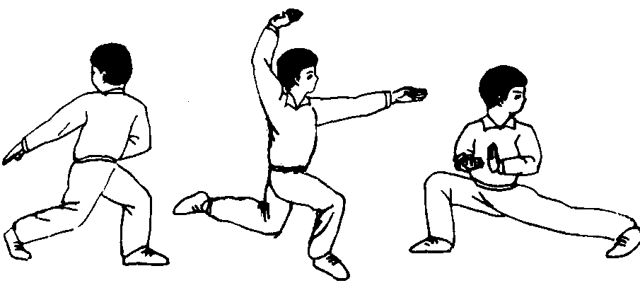 | 释义 | 跃步长拳步法之一。套路中跃步接仆步的动作较多见。其基本练习为:❶两脚前后开立,左脚在前,右脚在后;躯干稍左转,双臂向左侧后摆;左掌拇指向下,右掌拇指向上,目视左后方。