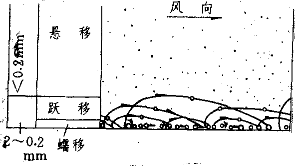 | 释义 | 跃移saltation风沙流中沙粒移动的3种(见“悬移”、“蠕移”)方式之一。当地表沙粒得到风的足够推力时,开始在地面上滑动和滚动,随着速度的加快,又由于相互间的碰撞,便产生离心分力,使沙粒骤然跳起,脱离地面,跃入空中,随风运行。这时的沙粒不仅高速自转,还具有较大的水平速度,沿抛物线前进。在飞行中,由于各种阻力和摩擦力的存在,不断消耗沙粒的动能和势能,受重力影响,飞行高度不断降低,以致沙粒与水平线呈锐角(10°~20°)下落,回到地表,与地表其他沙粒碰撞后继续跃动。其粒径多为中细沙(<0.5 mm,>0.05 mm),跳跃高度可达60~70 cm,数量约为全部输沙量的3/4。