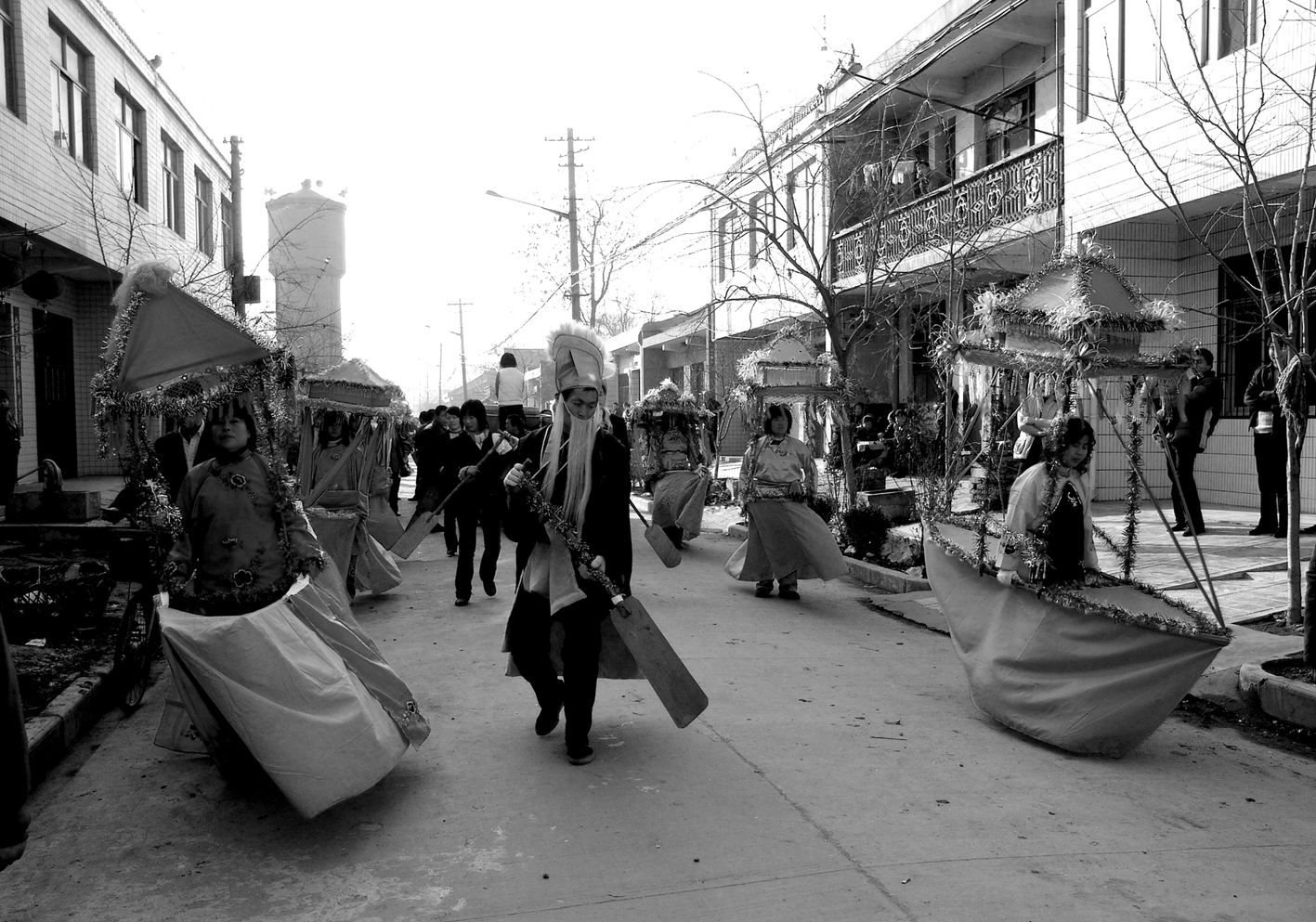 跑旱船中国汉族民间舞蹈。2000余年前早已产生。流传于中国广大地区。旱船用竹或秫秸扎成船形,饰以纸花、彩绸,船形下用布围之,晚间船上燃起灯烛。一般旱船长1.6~2.4m,也有3~4 m长的。有1条船2人扮演渔家夫妇或父女的,也有2~10条船以上由1人领唱,众人合唱伴舞表演的。 跑旱船传统民间文娱活动。流传较广。船身大小各异,大者近三米,小者一米多。常以竹木缚扎而成,上搭顶棚,下穿船衣。船衣垂于地面,画有水纹、波涛或太阳、花鸟等图样。舞者将船系于腰间,呈坐船状。另一人船外划桨,两人合舞。表演内容多取材于古代戏曲和神话传说。 |