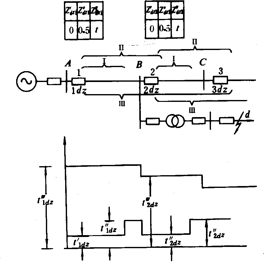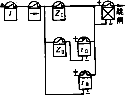 图1 三段式距离保护的组成元件及逻辑回路的简化接线 为了满足速动性、选择性及灵敏性的要求,输电线路的距离保护,广泛应用具有三段动作范围的时限特性(图2),分别称为距离保护的Ⅰ、Ⅱ、Ⅲ段,距离保护Ⅰ段是瞬动的,保护线路全长的85%,保护1的动作阻抗整定值为Z′dz1=0.85Z′1,式中Z′1为被保护线路的总阻抗。距离保护Ⅱ段保护线路全长,动作阻抗整定值Z″dz1按下述原则整定:❶与相邻线路距离保护Ⅰ段相配合Z″dz1=KK(Z′1+Kfz·min×0.85Z12),式中KK为可靠系数,取0.8;Z12为相邻线路的总阻抗;0.85Z12为相邻线路距离保护Ⅰ段的动作阻抗Z′dz2;Kfz·min为最小分支系数,等于相邻线路Ⅰ段保护范围末端短路时,故障线路(BC)上通过的短路电流与前一级保护所在线路(AB)上通过的短路电流的比值。 ❷躲过线路末端变电所低压侧(d1点)故障,Z″dz1=K′K(Z1+Kfz·min×Zb),式中KK为可靠系数,取0.7;Zb为变压器阻抗;Kfz·min为d点短路时分支系数最小值。取上两式计算值较小者为整定值。 ❸距离Ⅱ段在线路末端短路时的灵敏系数K1m=Z″dz1/ZAB>1.25,第Ⅱ段保护的时限为t″dz=△t=0.5秒(与相邻线路距离Ⅰ段配合时)或t″dz·xl·max+△t。式中t″dz·x1·max为相邻线路Ⅱ段保护的最大动作时限。距离Ⅲ作为Ⅰ、Ⅱ段保护的后备保护(近后备), 也作为相邻线路保护装置和断路器拒绝动作的后备保护(远保护)。动作阻抗Zdz1按躲过负荷的最小阻抗整定:Z″′dz=Zfh·min/KK·Kh·Kzq。式中KK为可靠系数,取1.3;Kh为继电器的返回系数,取1.1~1.15;Kzq为负荷自启动系数,大于1;Zfz·min=Uf·min/If·max为负荷的最小阻抗。Uf·min为母线最低电压,If·max为最大负荷电流。当采用方向阻抗继电器时,上式右边还要除以cos(1m-fh),1m为阻抗元件的最灵敏角;fh为负荷阻抗角。当作为近后备时,Ⅲ段保护的灵敏系数K1m=Z″′dz/Z1>1.5,当作远后备K1m=Z″′dz/(Z1+Kfz·max·Z12)>1.2。式中Kfz·max为相邻线路末端短路时的最大分支系数。