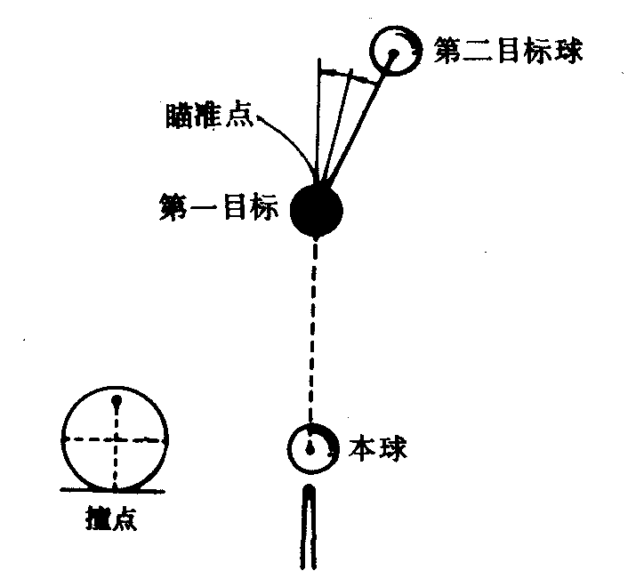 | 释义 | 跟球杆法台球击球的一种方法。是用撞点为中上部的杆法击球,本球碰撞第1目标球,该球被撞走之后,本球随着继续前进,去碰撞第2目标球。跟球的基本瞄准方法是以第1目标球和第2目标球的中心为连结线,再以本球和第1目标球的中心连线延长,将这两条线形成的角度二等分,在第1目标球的外缘有个相交点,即为跟球的瞄准点。(图2—3—39)