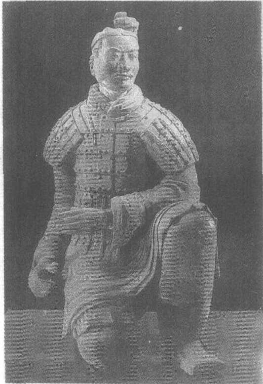 | 释义 | 跪射武士陶俑秦。高120厘米。陕西省临潼县秦始皇陵东侧1号兵马俑坑出土。陕西省博物馆藏。20世纪70年代以前,中国的雕塑史对在历史长河中仅占15年的秦代雕塑多是一提而过。直到1974年3月在陕西临潼发现秦陵随葬大型陶兵马俑武士俑群的葬坑后,才真正打开了秦代雕塑艺术的宝库,使后人认识到秦代这种艺术的飞跃发展和高度成就。现已发掘三个兵马俑坑总面积达二万多平方米,兵马俑七千件以上,为步兵和车兵的混合编制。俑人身高约1.85米,陶马高约1.6米。陶俑按姿态、服饰、装备等区分不同的兵种和职司,个个精神抖擞,严肃威武,如临战场。人物形象多样,作风写实。陶马分驾车、乘骑两种,其出神的塑造无不表现出机警神骏。这些兵马俑的发现为研究秦代的政治、经济、军事、文化艺术和科学技术提供了宝贵的实物资料。武士俑中以跪射俑塑造得最为出色。此俑短褐披甲,右膝着地,左腿弯曲作半跪状,双手向右侧作握弓姿势。俑的面部表情严肃,神态沉着,动作机警,是一位久经沙场的优秀弩弓手。