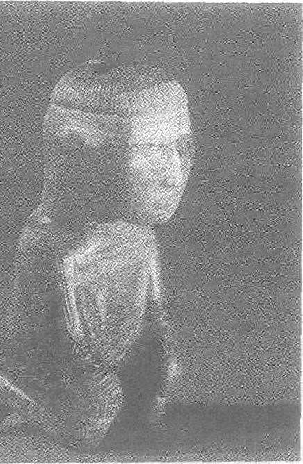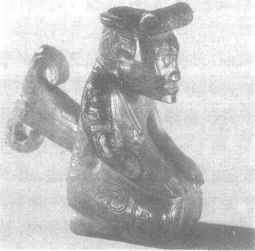 | 释义 | 跪式玉人商。高8.5厘米。1976年河南省安阳市殷墟妇好墓出土。北京中国社会科学院考古研究所藏。体为褐色,面呈淡绿色,为一圆雕跪坐像。头和颈在通体中所占比例较大。身体略前倾,头微低,脸庞较圆,平眉,臣字形目,小口,两耳和鼻较大,鼻孔微显。头顶中部梳一小辫下垂至脑后,辫上似缚发绳。身穿窄袖长衣,衣上饰蛇纹与云纹。敞胸,有兽面纹文身。两腿间有一圆孔,可供插嵌。殷墟妇好墓见“殷墟妇好墓”条目。
